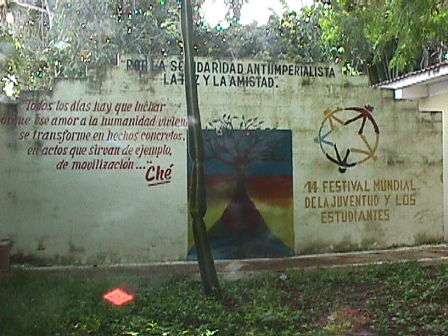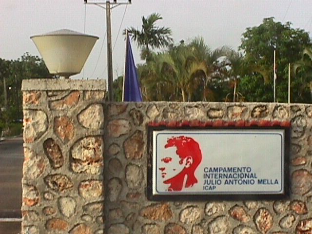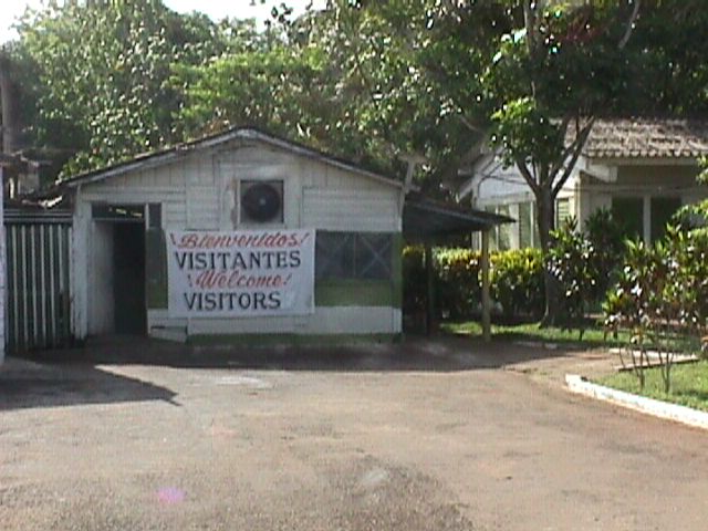Your first stop today is at an international work camp. Brigades from all over the world come here to help work in the citrus fields. Cubans also come here to work. Oranges are grown, and they require much caring. When the oranges are still growing, weeds must be pulled out of the ground and vines pulled off of the orange trees. Later in the season, the oranges must be picked. At the camp, there is a kitchen, nightly entertainment, and a small store.