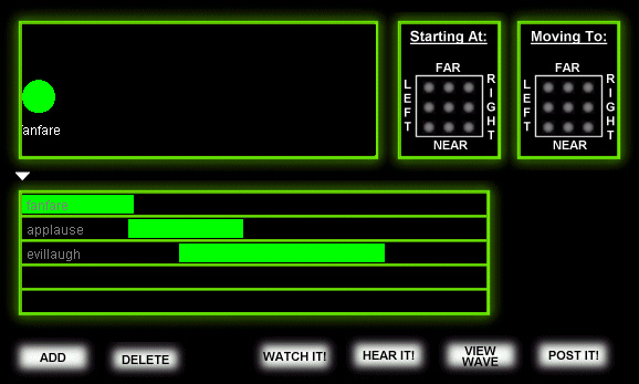 Now, focus your attention to the right side of the screen. You will see two windows, one titled with "Starting At" and the other with "Moving To". Each has an array of nine circles that represent positions in space. (The center circle in each window is currently green, which means it is selected). The circles in the "Starting At" window represent the position of your sound when it begins playing, while those in the "Moving To" window represent the final location of your sound. We wanted to make our bird fly from left to right, so in "Starting At" let's select the lower left hand circle by clicking on it. We chose a circle on the left since that's where we want the bird to start, and we chose the lower one because the lower circles represent locations nearer to us, so we'll be able to hear it clearly. Then, for "Moving To," select the lower right circle. This means that the bird will end up on our right, still near to us. To make sure, let's click the "Watch It!" button, and watch the large window above the timeline. You will see a green circle move across the window from left to right. This circle represents your bird sound moving from left to right. To stop the animation, click the button again, which now says "Pause".