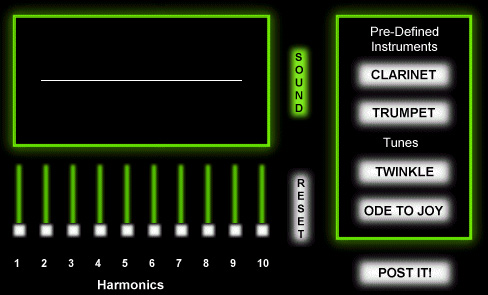 "The Harmonics Applet allows you to play with harmonics to produce instrument sounds similar to the sounds real instruments make. This applet takes the place of an electric synthesizer. The only difference is that you make the sounds! You can also play songs with the instruments you have made!